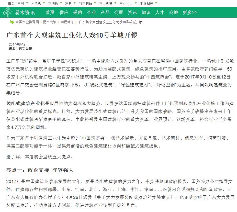 中國木材網(wǎng)發(fā)布有關(guān)2017中國筑博會·廣州開幕式的報道 (2017-10-30)