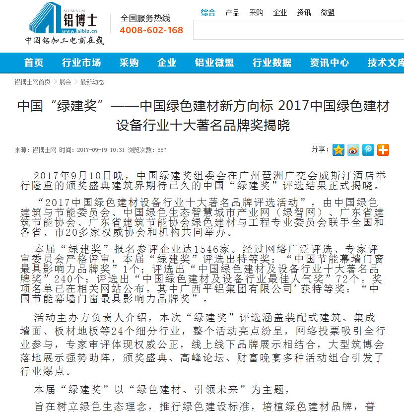 綠建之窗網(wǎng)發(fā)布有關(guān)2017中國(guó)綠色建材設(shè)備行業(yè)十大著名品牌獎(jiǎng)的報(bào)道 (2017-10-31)